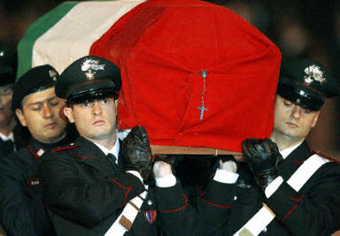 11月15日,在意大利駐伊憲兵總部爆炸中遇難的19名意大利人靈柩被運(yùn)抵意首都羅馬。11月12日,駐扎在伊拉克南部城市納西里耶的意大利憲兵部隊(duì)總部遭受汽車(chē)炸彈爆炸襲擊,造成至少19名意大利人和9名伊拉克人死亡,上百人受傷。