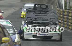澳門第五十屆格蘭披治大賽車十六日進行的比賽中,一輛賽車的引擎蓋突然掀開,該車手竟奇跡般的將賽車開回發(fā)車點。中新社記者:李剛