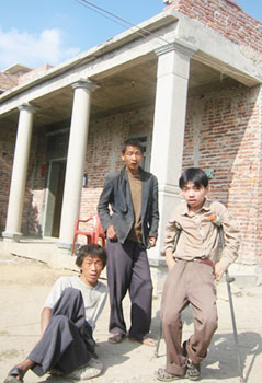 12月6日記者采訪了戴家。戴家的兩位老人已經(jīng)去世多年。扔下了4個(gè)殘疾孩子和老母親。戴家的長(zhǎng)子戴清鎮(zhèn),37歲,患有精神病,經(jīng)常發(fā)作。記者沒(méi)有看到他,據(jù)隨行的村干部說(shuō)他已經(jīng)離家出走多日,音訊全無(wú);二兒子戴金龍,30歲,癡呆,沒(méi)有任何勞動(dòng)能力;三兒子戴振明,28歲,小兒麻痹,完全癱瘓;四兒子戴暫缺,25歲,手拄雙拐。唯一的健全人是35歲的戴雙治。她和丈夫擔(dān)負(fù)起了照顧全家的重?fù)?dān)。