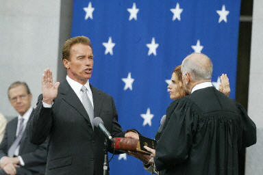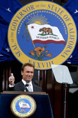 施瓦辛格是在10月7日加州州長罷免選舉中,一舉擊敗因赤字問題而飽受詬病的民主黨州長戴維斯以及其他競(jìng)爭(zhēng)對(duì)手,從而當(dāng)選新任州長的。