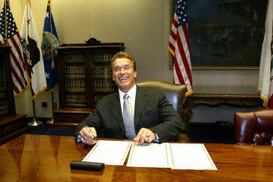 阿諾·施瓦辛格于美國當(dāng)?shù)貢r(shí)間11月17日宣誓就任加利福尼亞州第38任州長。施瓦辛格宣誓就職儀式吸引了大約740名記者參加,規(guī)?氨让绹偨y(tǒng)就職儀式,世界各地?cái)?shù)百萬觀眾觀看了儀式的現(xiàn)場直播。圖為施瓦辛格新官上任首日喜簽首個(gè)州長令。