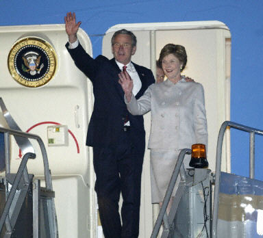 美國總統布什及夫人抵達倫敦希思羅機場,步出“空軍一號”專機,向歡迎人群揮手致意。