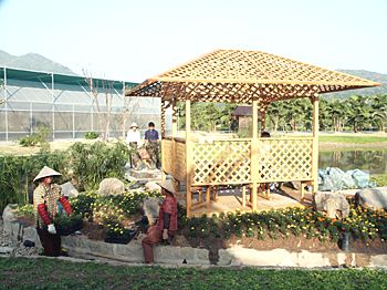 花博會期間,各種文化大餐精美絕倫,豐富多彩,將讓四海賓朋在四季如春的花博園盡情品味漳州深厚的歷史底蘊(yùn)和人文風(fēng)俗。圖為建設(shè)中的園藝小品。蔡文原 攝