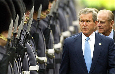 美國總統(tǒng)布什是繼1982年里根訪英以來,第一位正式應(yīng)伊麗莎白女王之邀到英國進(jìn)行國事訪問的美國總統(tǒng)。“歡迎”規(guī)格創(chuàng)新紀(jì)錄,在英國有很多人已提前動起來了:1.4萬名警察嚴(yán)陣以待,數(shù)十萬反戰(zhàn)人士整裝待發(fā)。
