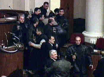 圖:格魯吉亞總統(tǒng)謝瓦爾德納澤倉促離開國會(huì)大廈