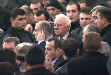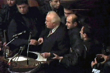 11月22日,格魯吉亞新一屆議會舉行第一次會議。當(dāng)謝瓦爾德納澤在議會演講時,幾十名反對派人士沖入議會大廈,要求總統(tǒng)辭職?偨y(tǒng)的支持者和反對派人士發(fā)生爭執(zhí),議會大廳一片混亂。謝瓦爾德納澤隨即在保鏢的保護下撤離,并表示拒絕辭職。