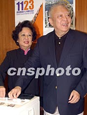 二零零三年香港特別行政區(qū)區(qū)議會選舉投票日十一月二十三日在香港十八個區(qū)同時進(jìn)行投票選舉,香港特別行政區(qū)行政長官董建華與夫人董趙洪娉一起來到圣若瑟英文書院投票。 中新社記者:錢興強