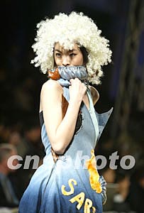 圖:中國國際時裝周上提醒預(yù)防SARS的時裝