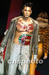 喜得龍.計(jì)文波時(shí)裝發(fā)布會(huì)二十五日晚在中國國際時(shí)裝周上舉行,一名男模特身繪火龍出場(chǎng),寓意中國時(shí)裝品牌發(fā)展的龍馬精神。中新社記者:毛建軍