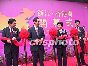由浙江省人民政府和香港特區(qū)政府主辦的浙江香港周活動(dòng)二十七日開幕。圖為浙江省委副書記喬傳秀、副省長鐘山、香港特區(qū)政府財(cái)政司司長唐英年出席開幕式。作者:張茵