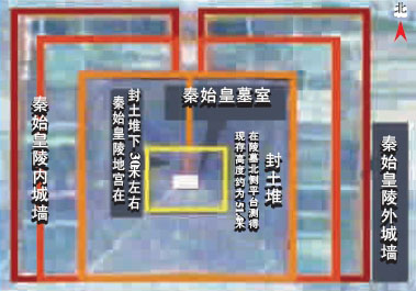 物探發(fā)現(xiàn)地宮中的墓室和宮墻均為石質(zhì)結(jié)構(gòu),地宮在封土堆以下30米左右,地宮中的墓室邊界東西長(zhǎng)約170米,南北寬約145米。這是一種迄今為止首次發(fā)現(xiàn)的墓葬形式,在物探考古過(guò)程中,專(zhuān)家還發(fā)現(xiàn)大范圍、強(qiáng)異常的汞含量,初步證實(shí)了《史記》中記載的“以水銀為百川、江河、大!钡恼鎸(shí)性。