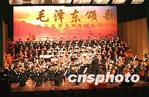 為紀(jì)念毛澤東誕辰110周年,《毛澤東頌歌大型音樂會(huì)》十二月五日晚在北京民族宮劇場舉行。中國最高級別文藝團(tuán)體演出的歌唱毛澤東頌歌,讓人回憶起激情燃燒的歲月。中新社記者:史利