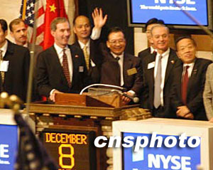 美東時(shí)間十二月八日上午,首次訪(fǎng)美的中國(guó)總理溫家寶來(lái)到紐約證券交易所,為周一股市九點(diǎn)半開(kāi)盤(pán)鳴鐘。中新社記者 陳建 攝