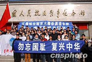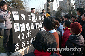 十二月十三日中午,一群臂纏黑紗、胸戴白花的年輕人拉起“勿忘國恥”的橫幅,在北京中華世紀(jì)壇附近紀(jì)念南京大屠殺六十六周年。這些年輕人通過互聯(lián)網(wǎng)自發(fā)組織在一起,他們中有公司職員也有大學(xué)生。圖為紀(jì)念活動吸引大批市民。中新社記者 張煒