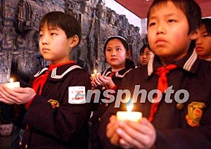 十二月十三日,南京大屠殺遇難同胞66周年祭暨《改造日本戰(zhàn)犯紀(jì)實(shí)》展覽在北京中國人民抗日戰(zhàn)爭紀(jì)念館舉行,來自盧溝橋小學(xué)的同學(xué)們手捧蠟燭,向在抗日戰(zhàn)爭中遇難和犧牲的同胞和英烈致以沉痛哀悼。中新社記者:武仲林
