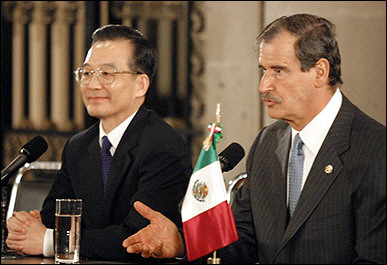 會(huì)談開始前,福克斯在國民宮中央庭院為溫家寶正式訪問墨西哥舉行歡迎儀式。在軍樂隊(duì)演奏了兩國國歌后,?怂怪略~熱烈歡迎溫家寶訪墨。他表示,溫總理首次出訪即選擇了墨西哥,表明兩國都期待著進(jìn)一步加強(qiáng)雙邊關(guān)系。中國在國際舞臺(tái)上作用日益重要,墨西哥愿與中國一道為共同營造更繁榮、更平等的世界而努力。溫家寶在答詞中表示期望通過訪問,與墨方增強(qiáng)互信、擴(kuò)大共識(shí)、深化合作、共謀發(fā)展,使兩國友好合作關(guān)系進(jìn)入新的發(fā)展時(shí)期。隨后,兩國領(lǐng)導(dǎo)人檢閱了儀仗隊(duì)。溫家寶和?怂惯走到少年兒童歡迎隊(duì)伍中,慈愛地與他們擁抱和握手,引起孩子們的陣陣歡呼和掌聲。