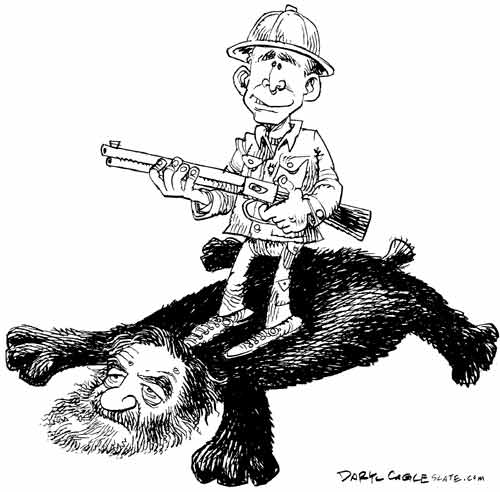 布什拿著槍,踩著薩達姆這只“大熊”。