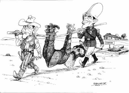前為美國總統(tǒng)布什,后為英國首相布萊爾,看著薩達姆這個大“獵物”。原載奧地利《Kleine Zeitung》報