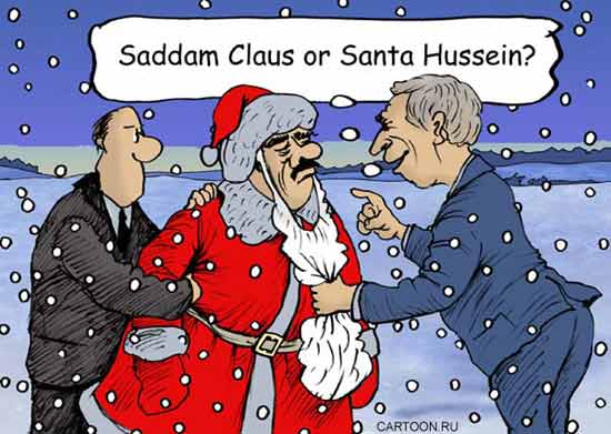 布什:“我都搞不清你是圣誕老人還是薩達姆了!”。(編者注:有觀察家指出,薩達姆的被捕,對布什而言是一份天大的圣誕節(jié)禮物),原載俄羅斯圣彼得堡市《Obshaya Gazeta》報