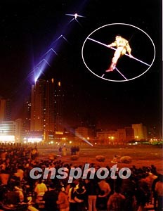 十二月十八日夜晚,被譽(yù)為“高空王子”的阿迪力在廣東汕頭上空成功走過(guò)一根四百二十六米長(zhǎng)的鋼索。作者:杜一方