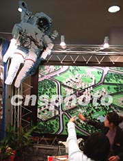 十二月中旬正在北京舉行的冬季房展會(huì)上,一家房地產(chǎn)開發(fā)商請(qǐng)來“太空人”模型為樓盤促銷。作者:張雷