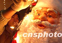 一名北京青年民工十二月底為商家裝飾圣誕老人燈光,迎接圣誕節(jié)紅火大促銷。中新社記者:賈國榮