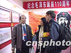 毛澤東兒媳邵華十二月二十三日在湖南韶山舉辦個人攝影作品展覽,以紀(jì)念父親毛澤東誕辰一百一十周年。圖為邵華將軍向參觀者介紹自己的得意之作。作者:白祖偕