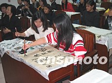 參加“二零零三印尼華裔青少年中國(guó)民族舞蹈及中華武術(shù)冬令營(yíng)”的印尼少年,圣誕節(jié)期間在湖南練習(xí)中國(guó)書法。作者:李斌
