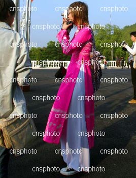 新年前,一位身著越南旗袍的中國姑娘在越南一旅游區(qū)拍照。這種被譽為越南國服的旗袍受到一些中國姑娘喜歡。宋吉河 攝