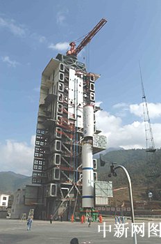 圖:"長征二號丙"改進(jìn)型運(yùn)載火箭一、二級吊裝上發(fā)射塔架