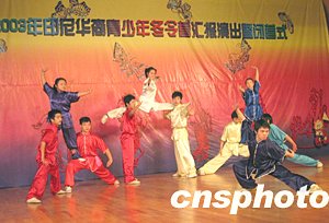中新社長沙十二月二十九日電(殷敏鴻 鄧霞)二十九日上午,在湖南師大音樂學(xué)院演奏廳舉行了印尼華裔青少年中國民族舞蹈及中華武術(shù)冬令營匯報演出暨閉營式,伴隨著悠揚的音樂,小營員們身著中國傳統(tǒng)民族服裝,像模像樣地向臺下的中國觀眾表演了八天來在中國學(xué)到的民族舞蹈和中國功夫,博得陣陣熱烈掌聲。