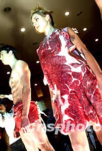 二十九日晚在北京舉行的NE.TIGER時(shí)尚峰會上,模特展示一款別開生面的“牛肉裝”,設(shè)計(jì)者將牛肉演化為天然面料,制成薄薄的長裙,使動(dòng)物的物質(zhì)本身創(chuàng)造性地體現(xiàn)了人的奇異視覺美感。中新社記者:毛建軍