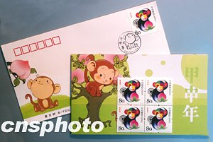2004年是甲申年,按中國十二生肖排序?yàn)楹锬。北京市郵票公司為配合國家郵政局在2004年1月5日發(fā)行《甲申年》特種郵票(生肖猴票、1套1枚),特設(shè)計(jì)和印制了該郵票的首日封(左)、郵折(右)等郵品,與郵票同時發(fā)行!都咨昴辍诽胤N郵票面額是80分。中新社記者:鄒憲