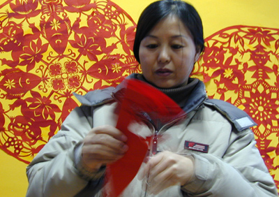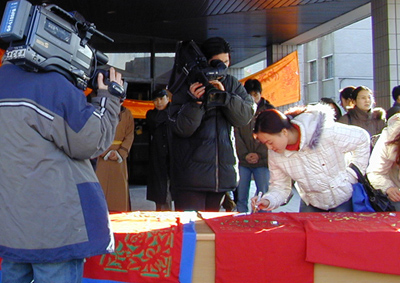 中新網(wǎng)1月2日電 正全力完成中國(guó)民間剪紙成為聯(lián)合國(guó)教科文組織非物質(zhì)文化遺產(chǎn)申報(bào)工作的中央美術(shù)學(xué)院非物質(zhì)文化遺產(chǎn)研究中心,2004年元旦這天在北京大學(xué)舉辦了第二屆“青年文化遺產(chǎn)日”活動(dòng),為支持剪紙藝術(shù)列入文化遺產(chǎn),全國(guó)26所高校的學(xué)生代表,在北京大學(xué)舉行支持中國(guó)剪紙申報(bào)文化遺產(chǎn)的簽名活動(dòng)。