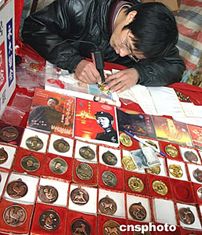 元旦期間湖南韶山的旅游商品攤點(diǎn)上,攤主忙著為游客在仿制的毛澤東像章上刻名留念。新年假期,參觀毛澤東故鄉(xiāng)的游客劇增。中新社記者:宋吉河