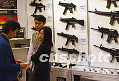 元月六日在香港會展中心開幕的“第三十屆香港玩具展”上,玩具商展示的仿真槍吸引參觀愛好者。中新社記者:錢興強(qiáng)