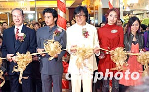 歌影紅星謝霆鋒、成龍、容祖兒、人氣組合Twins及名人何鴻燊等人1月9日在香港銅鑼灣親臨英皇鐘表珠寶分店開幕禮,并舉行剪彩儀式。中新社記者:鄧慶樂