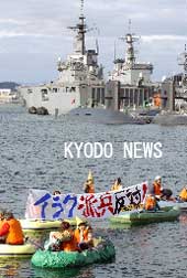 參加游行的25人,分開乘坐13條橡膠船。揭起“絕不允許自衛(wèi)隊的海外派兵”的橫幅,在可能被派遣的艦艇“國東”的附近舉行海上游行。