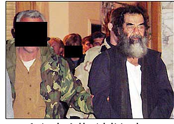 在被從骯臟的地下藏身地拖出來之后,他就被帶到了附近底格里特壯麗的大理石皇宮中。當(dāng)他被帶進(jìn)從前富麗堂皇的皇宮司令部的一個(gè)房間時(shí),看到房間里擠滿了喜悅的美國部隊(duì),66歲的薩達(dá)姆看上去非常不知所措。
