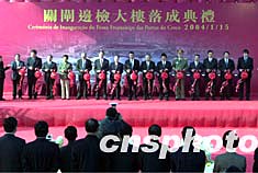 澳門特區(qū)關(guān)閘新邊檢大樓十五日舉行落成典禮,澳門特區(qū)行政長(zhǎng)官何厚鏵、全國(guó)政協(xié)副主席馬萬祺、中央駐澳門聯(lián)絡(luò)辦主任白志健、國(guó)務(wù)院港澳辦副主任周波、廣東省常務(wù)副省長(zhǎng)湯炳權(quán)等出席典禮儀式并為新大樓落成剪彩。作者:李剛