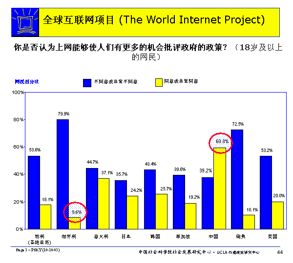 大多數人不相信互聯(lián)網可以使人們有更多的機會批評政府的政策。只有8.6%的匈牙利人同意或非常同意上網可以使人們對政府工作有更多的發(fā)言權。而意大利的網民中有37.1%的同意或非常同意這一點。