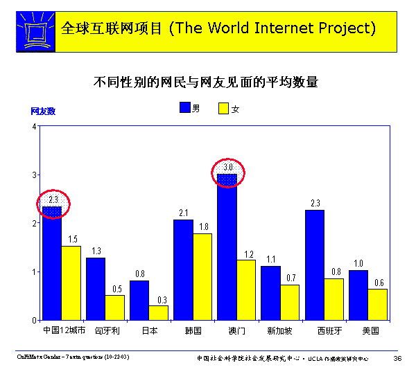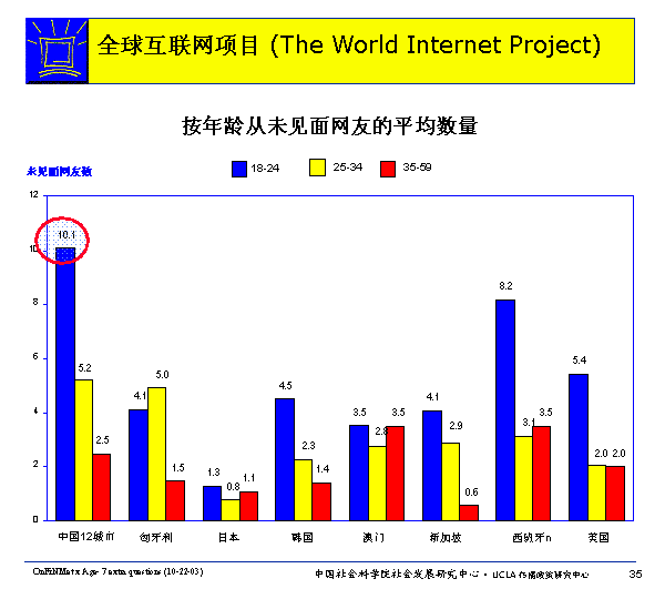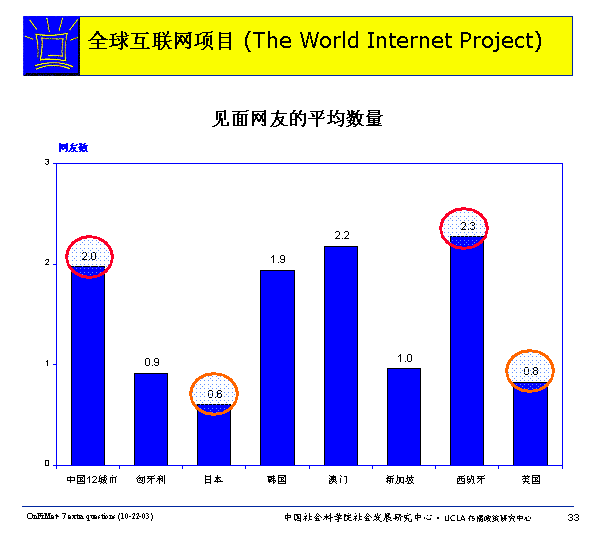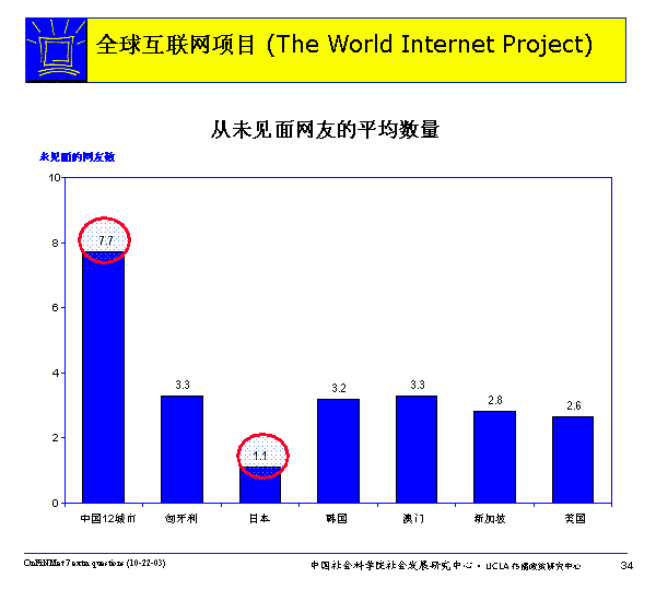 不同國家的網(wǎng)民中從未和網(wǎng)友見面的人的比例也不相同。在這方面,中國網(wǎng)民中從未和網(wǎng)友見面的人數(shù)最高,達到了7.7%,而日本則最低(1.1)。當(dāng)然,這還需要參照各國網(wǎng)民實際在網(wǎng)上交友的數(shù)量進行比較研究。