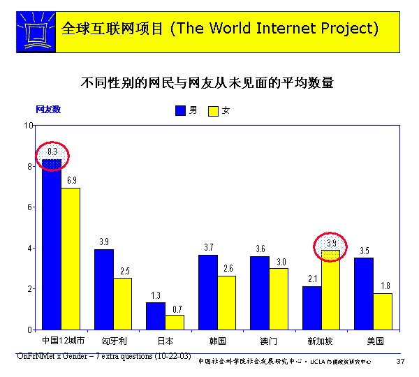 在大多數(shù)國家里,男性網(wǎng)民與網(wǎng)友從未見面的平均數(shù)量要多于女性網(wǎng)民。例外的國家是新加坡。