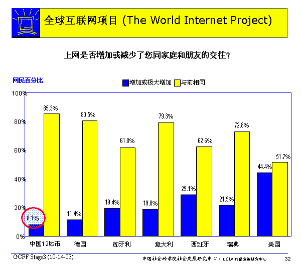 中國(guó)只有少量被訪網(wǎng)民認(rèn)為上網(wǎng)增加了他們同家庭和朋友之間的交往,很可能是因?yàn)橹袊?guó)人更加看重親友之間面對(duì)面的直接交往。