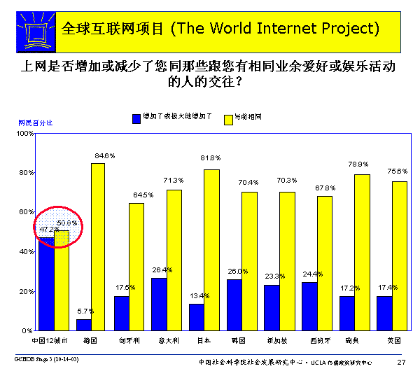 然而,還是有相當數(shù)量的網(wǎng)民認為使用互聯(lián)網(wǎng)增加了他們同跟他們有相同業(yè)余愛好或相同娛樂活動的人的交往;這樣的網(wǎng)民在中國最多,47.2%被調查的中國互聯(lián)網(wǎng)網(wǎng)民認為互聯(lián)網(wǎng)增加了增加或極大的增加了交往。
