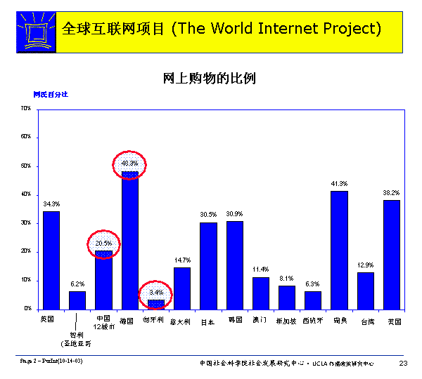 各國(guó)網(wǎng)民網(wǎng)上購(gòu)物的比例各不相同,德國(guó)為最高(48.3%),匈牙利為最低(3.4%) 。當(dāng)然,有網(wǎng)上購(gòu)物經(jīng)驗(yàn)不等于經(jīng)常上網(wǎng)購(gòu)物,也不等于在網(wǎng)上花很多錢購(gòu)物。按照社科院社會(huì)發(fā)展研究中心的數(shù)據(jù),中國(guó)網(wǎng)民上網(wǎng)購(gòu)物的頻次和網(wǎng)上購(gòu)物支出的錢數(shù)都是相對(duì)比較低的。