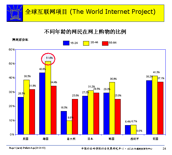 除意大利外,通常中年人更愿意在網(wǎng)上購(gòu)物。所有國(guó)家35-44歲之間的網(wǎng)民比16-24歲或55-64歲之間的網(wǎng)民更可能上網(wǎng)購(gòu)物。