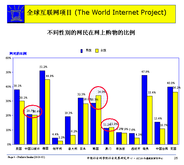 在除韓國(guó)和澳門以外的所有WIP國(guó)家里,男性比女性更可能網(wǎng)上購(gòu)物。