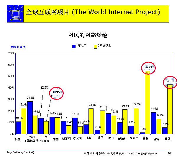 美國和瑞典有相當(dāng)高比例的網(wǎng)齡較長網(wǎng)民(42.8%的美國網(wǎng)民和54.6%的瑞典網(wǎng)民有長達(dá)5年或更長網(wǎng)齡)