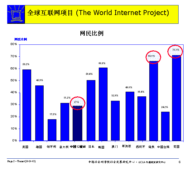 WIP項目各國的網(wǎng)民比例各不相同,美國最高(71.1%),除中國外,匈牙利最低(17.5%)。按照中國互聯(lián)網(wǎng)信息中心(CNNIC)的統(tǒng)計,中國網(wǎng)民占人口的比例大約為5%,按照這次參加“全球互聯(lián)網(wǎng)項目”的中國社會科學(xué)院社會發(fā)展研究中心對12個城市調(diào)查的數(shù)據(jù),網(wǎng)民占被調(diào)查城市的人口比例為29%。